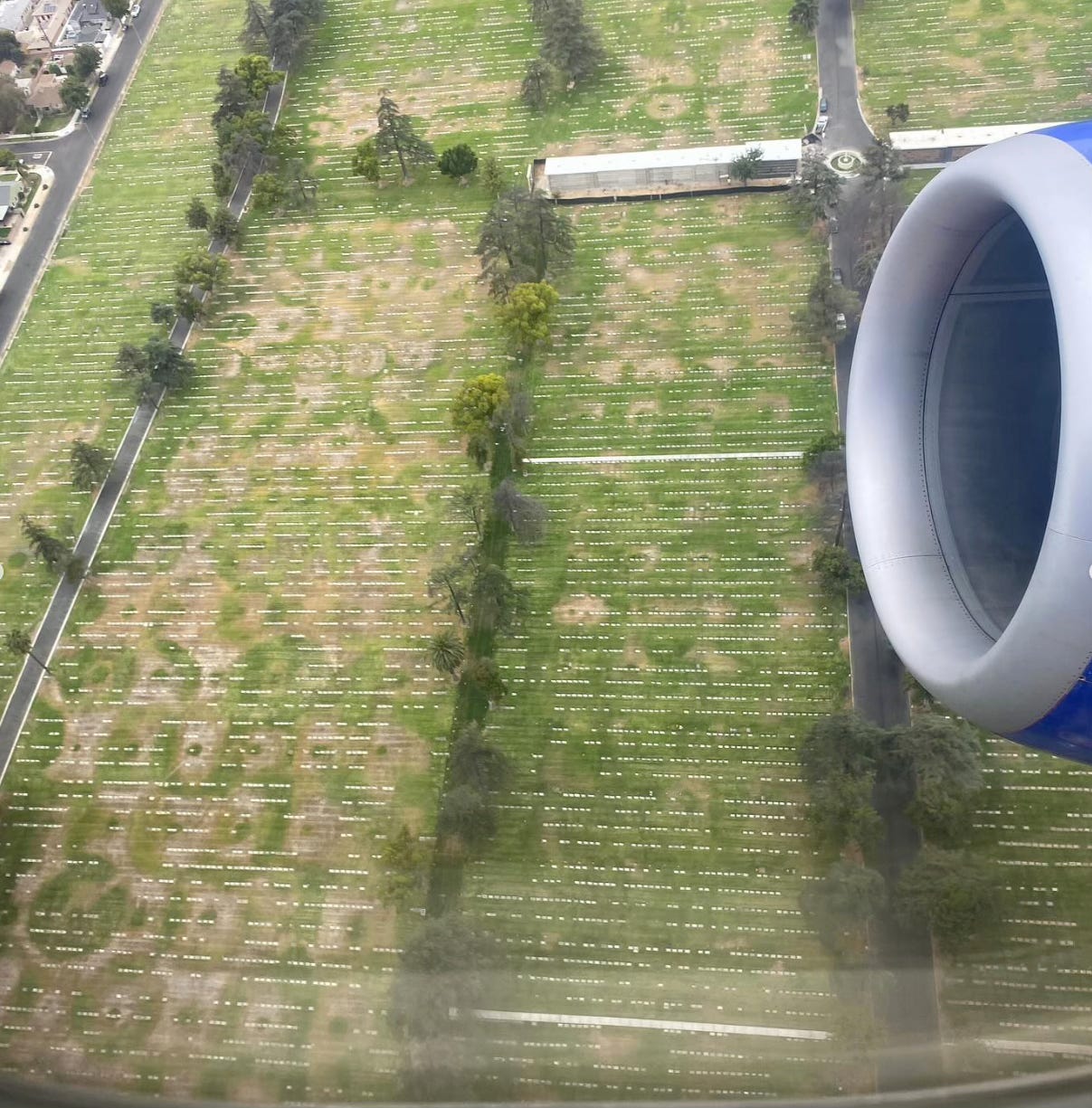 My plane points southwest 12000ft above the Inglewood cemetery. The tombstones are spaced out like Morse codes, or petrified white droppings of a Giant LA Rodent Releasing one primitively-designed turd at a time, on pastures destined to be paved over by homeless encampments with good Wi-Fi. Take me, captain crackhead, to my land of enchantment.